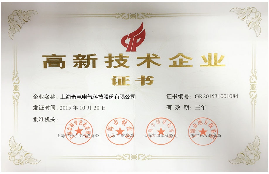 熱烈慶祝上海奇電電氣科技股份有限公司榮獲由上海市科技部、上海市財政部、上海市國家稅務總局和上海市地方稅務局聯合頒發的高新技術企業證書。